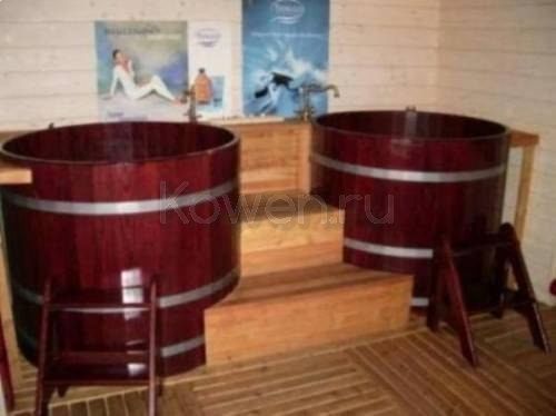 А если Вы выстроили домик в классическом японском стиле, то лучшим решением для бани будет сэнто. Коренное отличие в том, что в сэнто не нужен пар, но в обязательном порядке должна быть ванная. Она весьма специфическая. По виду больше напоминает бочку, человек в том направлении погружается по шею. В Японии принято сначало дочиста вымыться, позже облиться ледяной водой, и, напоследок, залезть в ванную с тёплой водой и отмокать там около часа. В ванную можно добавить разные масла и травы.