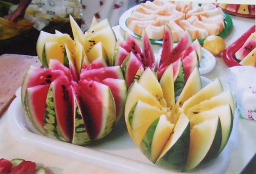 В большинстве случаев этих способов достаточно, чтобы порезать арбуз красиво и быстро. Но, имеется просто восхитительные варианты резки арбуза, который кроме того жалко кушать. Да и о скорости тут речи не идёт, приготовьтесь израсходовать пара часов на такую резку арбуза. Вот вам пара примеров: