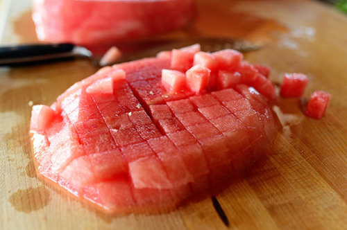 Основная неприятность при поедании арбузов — косточки и корка. И в случае если от косточек избавиться сложно, то от корки — несложнее несложного. Исходя по этому вот вам американский метод красиво порезать арбуз без корки. Арбуз режется пополам. Половинку арбуза кладём на разделочную доску мякотью вниз. Сейчас ножом бережно срезаем вершину. И срезаем по кругу корку и белую мякоть. У вас обязана остаться лишь красная мякоть арбуза. Мякоть режется сперва слоями, а после этого вдоль и поперек. Получаются аккуратные кубики арбуза, каковые можно имеется вилкой.