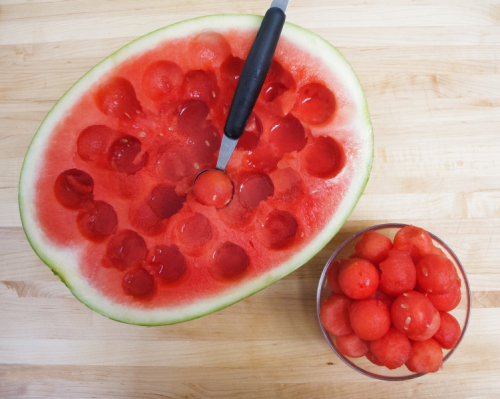 Еще один метод порезать красиво арбуз не такой стремительный. Для этого пригодится ложечка для мороженого. С её помощью можно сделать аккуратные шарики арбуза, каковые замечательно будут смотреться на столе.